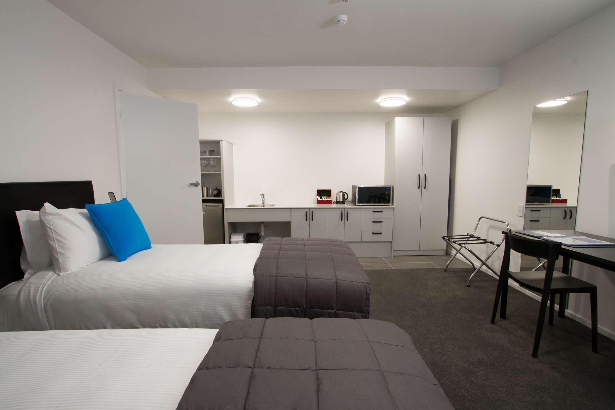 Together, Pia and I discussed Michael and Robyn's special requirements and decided on the Garden Access Studio, which gave them a little more space and the option of single beds, if they wanted them. The bathroom was ideal with a large wet shower area (and a seat if needed) as well as hand rails.